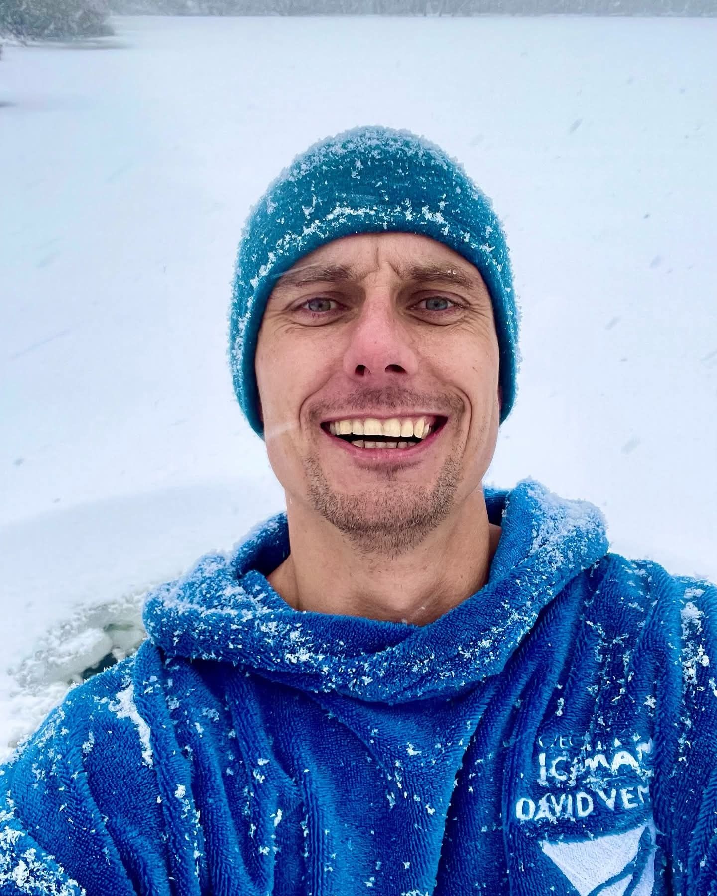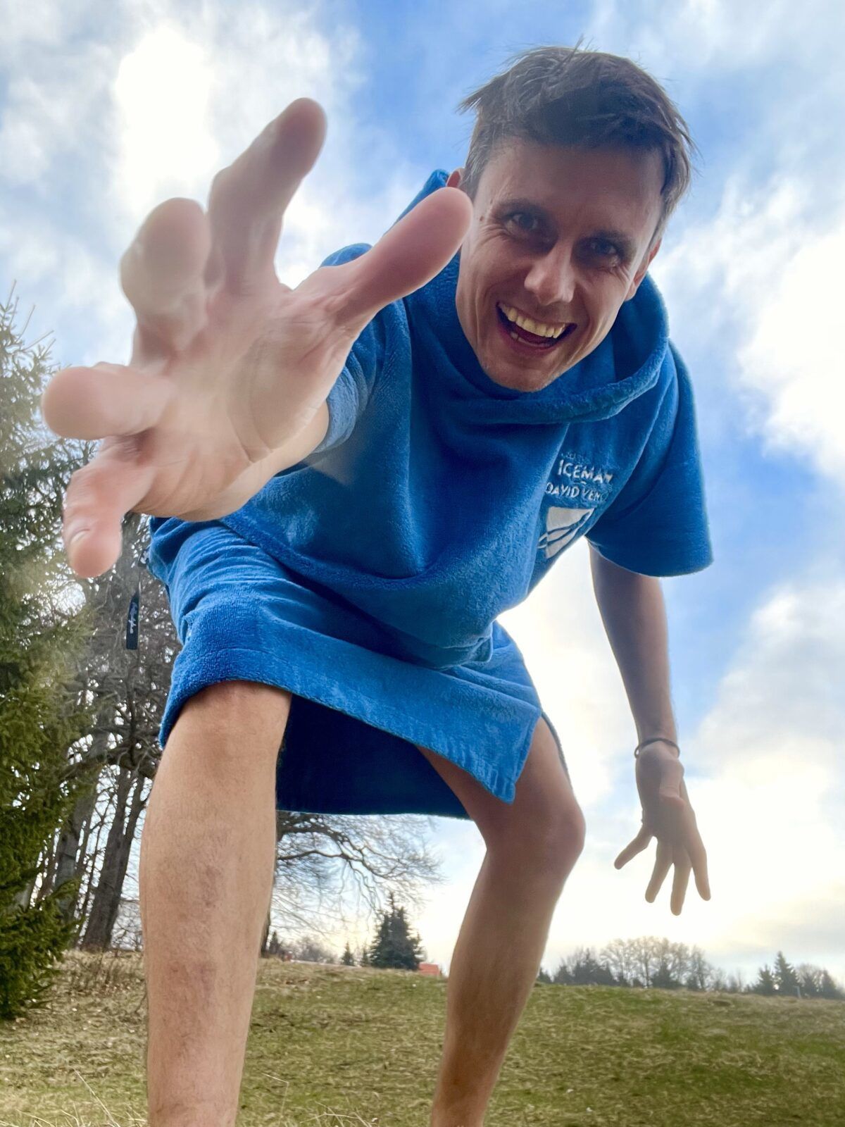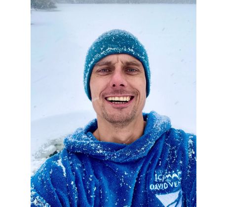 Klasické modré pončo, s bílou výšivkou ICEMAN, zadní kapsou na zip a s rozparky po stranách