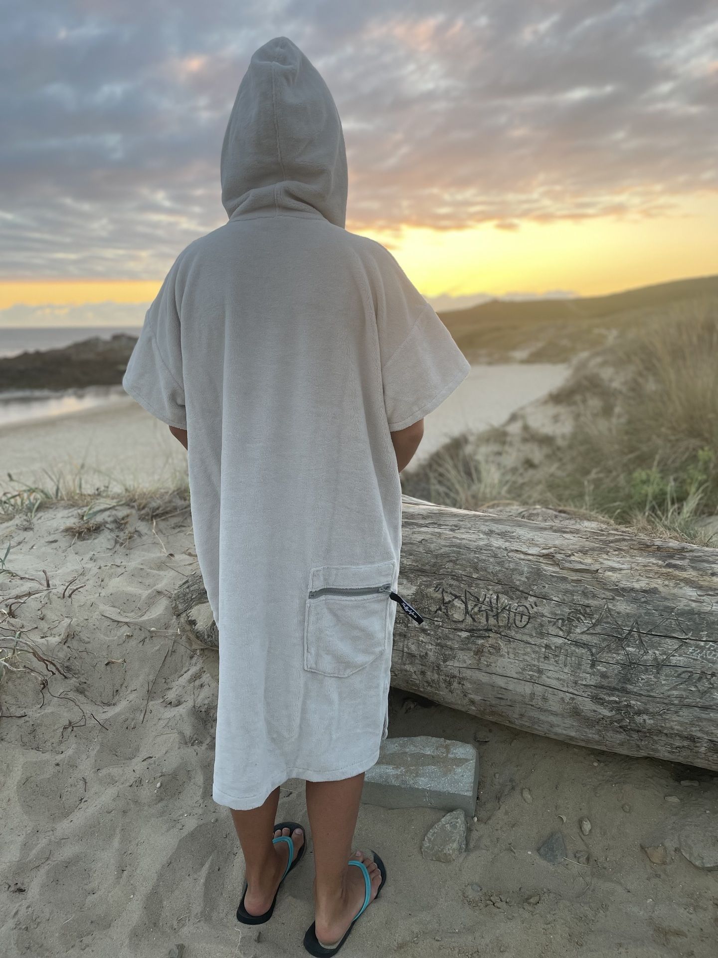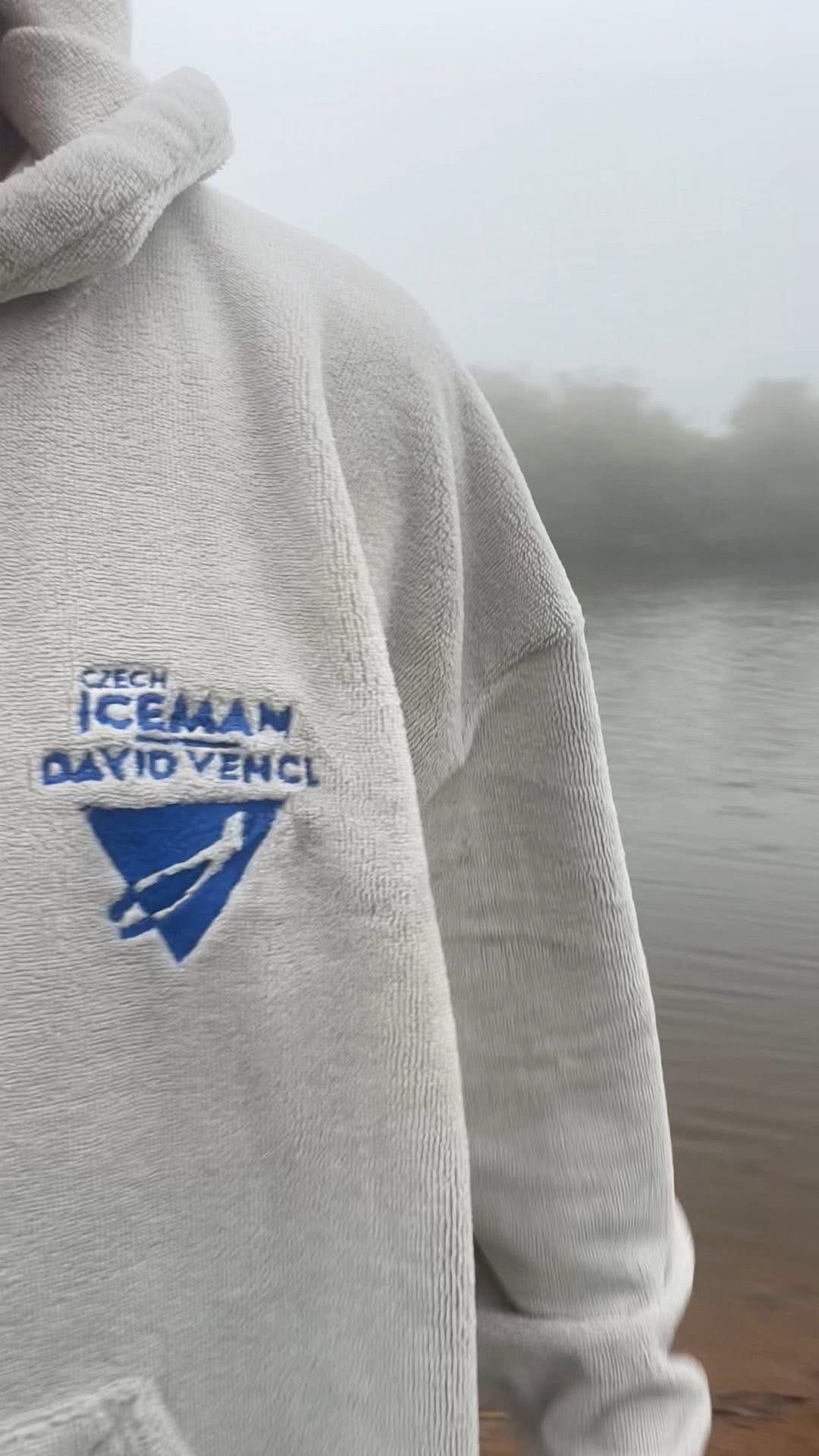Klasické světle šedé pončo, s bílou výšivkou ICEMAN, zadní kapsou na zip a s rozparky po stranách